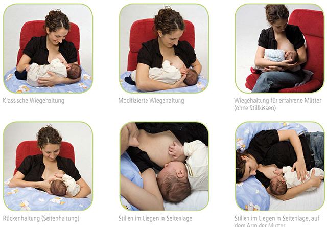 Die Kinderkrankenschwestern im Krankenhaus oder Ihre Hebamme werden Ihnen sicherlich verschiedene Stillpositionen zeigen. Die meisten Mütter bevorzugen die sogenannte Wiegeposition, bei der der Kopf des Babys in der Armbeuge liegt und von Ihrem Unterarm gestützt wird. Sie können Ihren Arm dabei auf einem Stillkissen oder einer Sofalehne, idealerweise auch Ihre Füße auf einem Hocker o. ä. ablegen. Denn zum Stillen braucht man vor allem Zeit und Ruhe. Wichtig ist also vor allem ein entspannter, stressfreier Ort, an den Sie sich zurückziehen können.